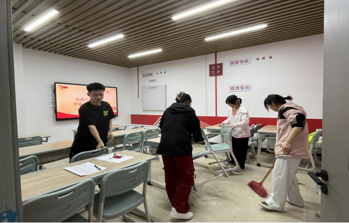 公共区域清洁组重点对一站式学生社区的活动教室进行清扫,捡拾垃圾、擦拭桌子及宣传栏;楼道维护,清理楼梯间杂物,对扶手、墙面污渍进行细致清洁;过程中,学生党员不怕脏、不怕累,分工协作、默契配合,认真清理每一个卫生死角。经过努力,学生社区环境焕然一新,公共区域干净整洁,楼道畅通明亮。