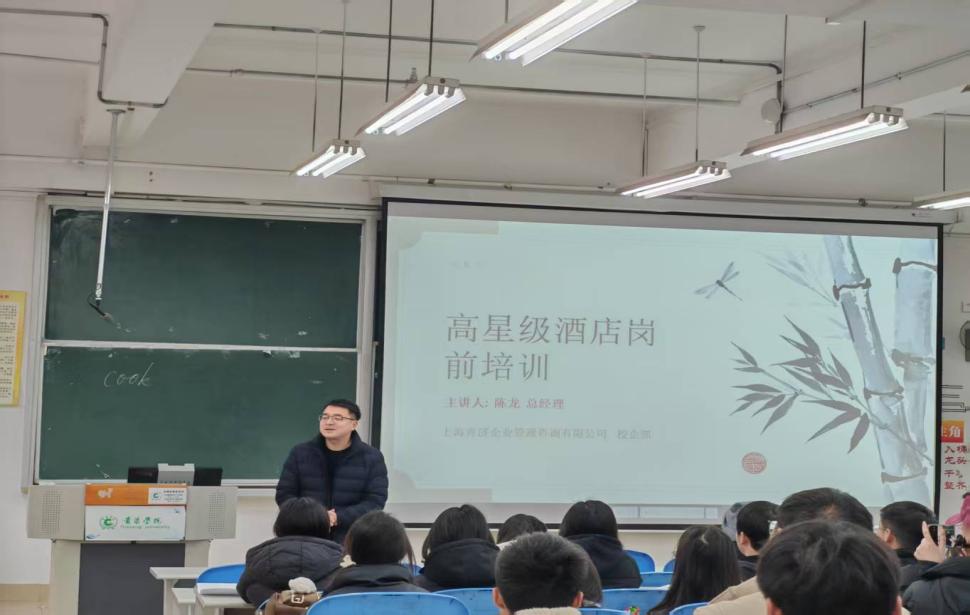 陈龙总经理立足行业前沿,系统解析了酒店业三大发展趋势:一是高端度假与城市商务酒店的差异化发展态势;二是数字化转型中智能客房、数据化客户画像等技术的应用场景;三是Z世代消费群体对“沉浸式体验”“低碳住宿”的新需求。他重点剖析了核心竞争力的构建路径,包括通过精细化服务流程打造“记忆点服务”、借力在地文化主题植入提升品牌溢价、建立员工赋能体系实现人才梯队可持续发展等。其次,通过洲际、亚朵等品牌案例,互动环节中,学生围绕“AI对酒店岗位的影响”“职业证书含金量评估”等问题踊跃提问,陈总结合行业招聘现状给出针对性建议,特别强调“复合型技能+行业深耕”将成为未来5年就业市场的关键竞争力。