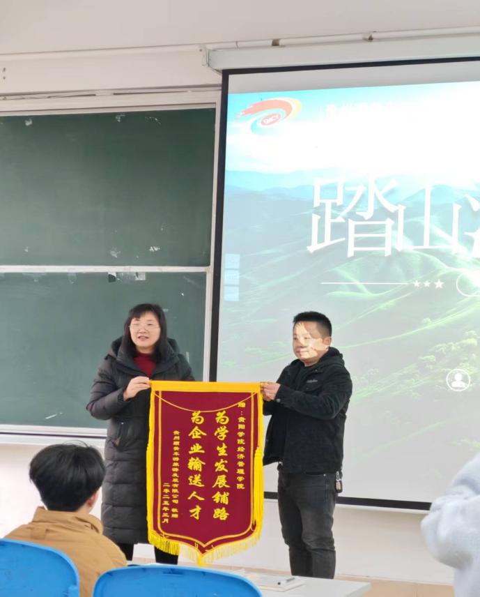 为感谢学院为公司输送的优秀学生,会前,贵州顺美车游旅游发展有限公司肖学舜董事长代表公司宣读了感谢信,并向黄咏梅书记颁发了“为学生发展铺路,为企业输送人才”的锦旗。